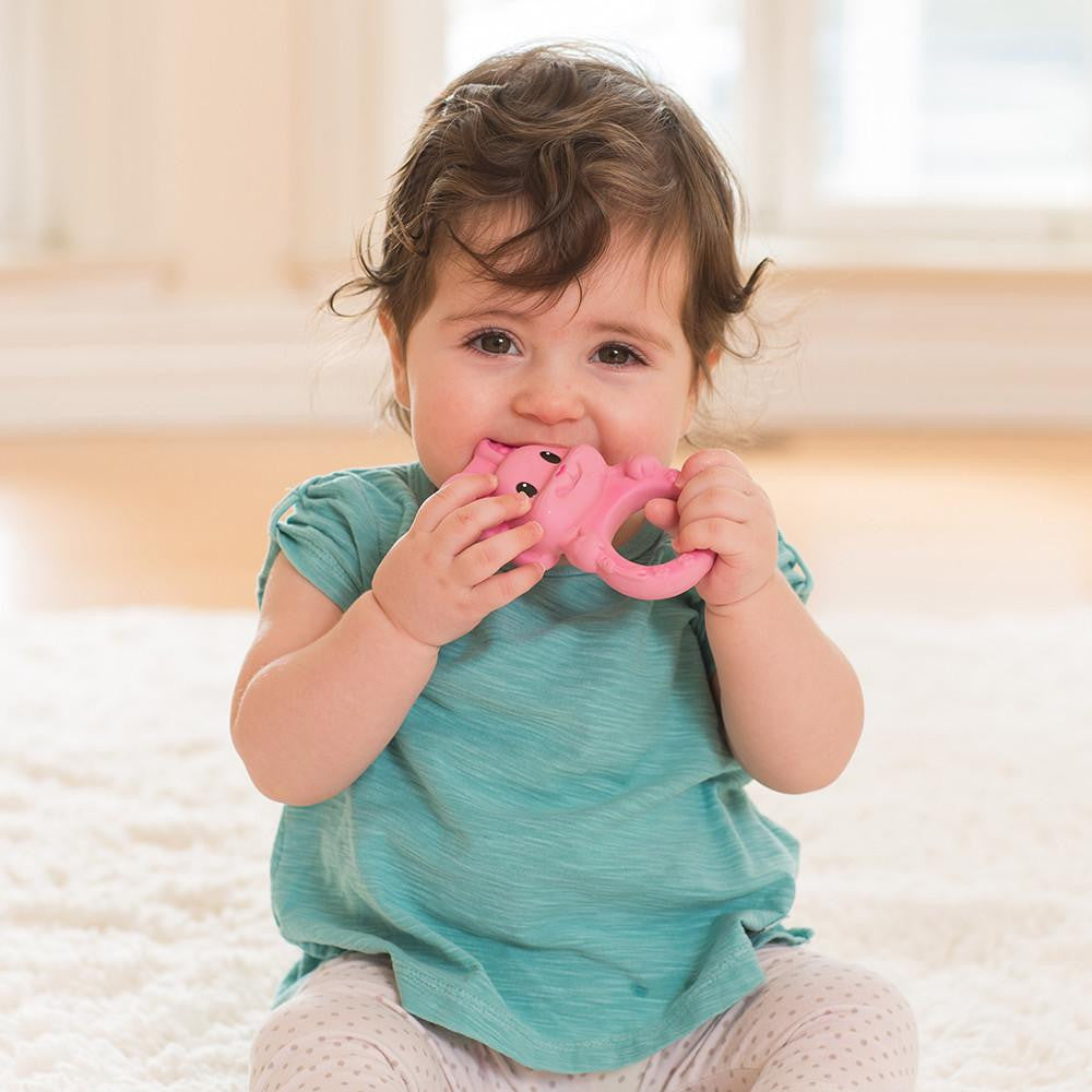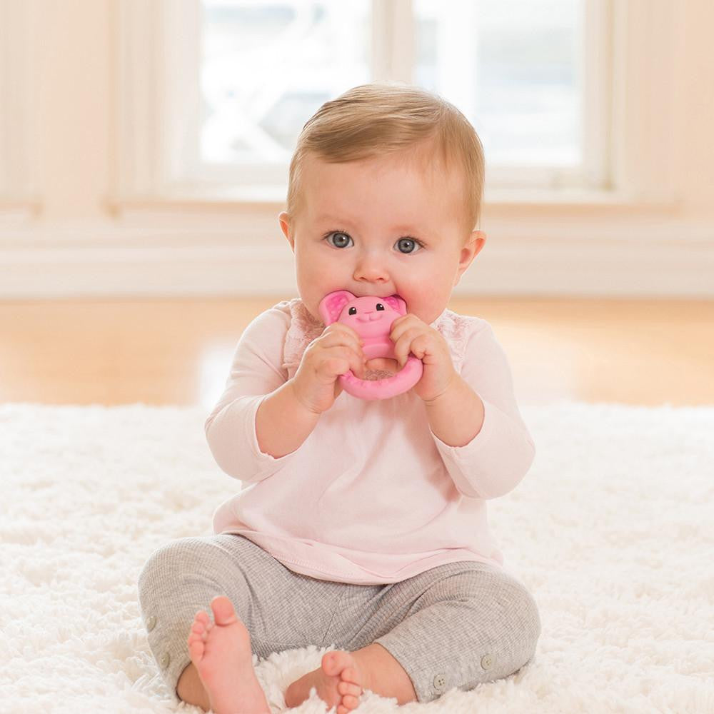 Made of all natural rubber, this cute baby bunny teether features an easy-to-grasp handle and bumpy textures to soothe tender gums.