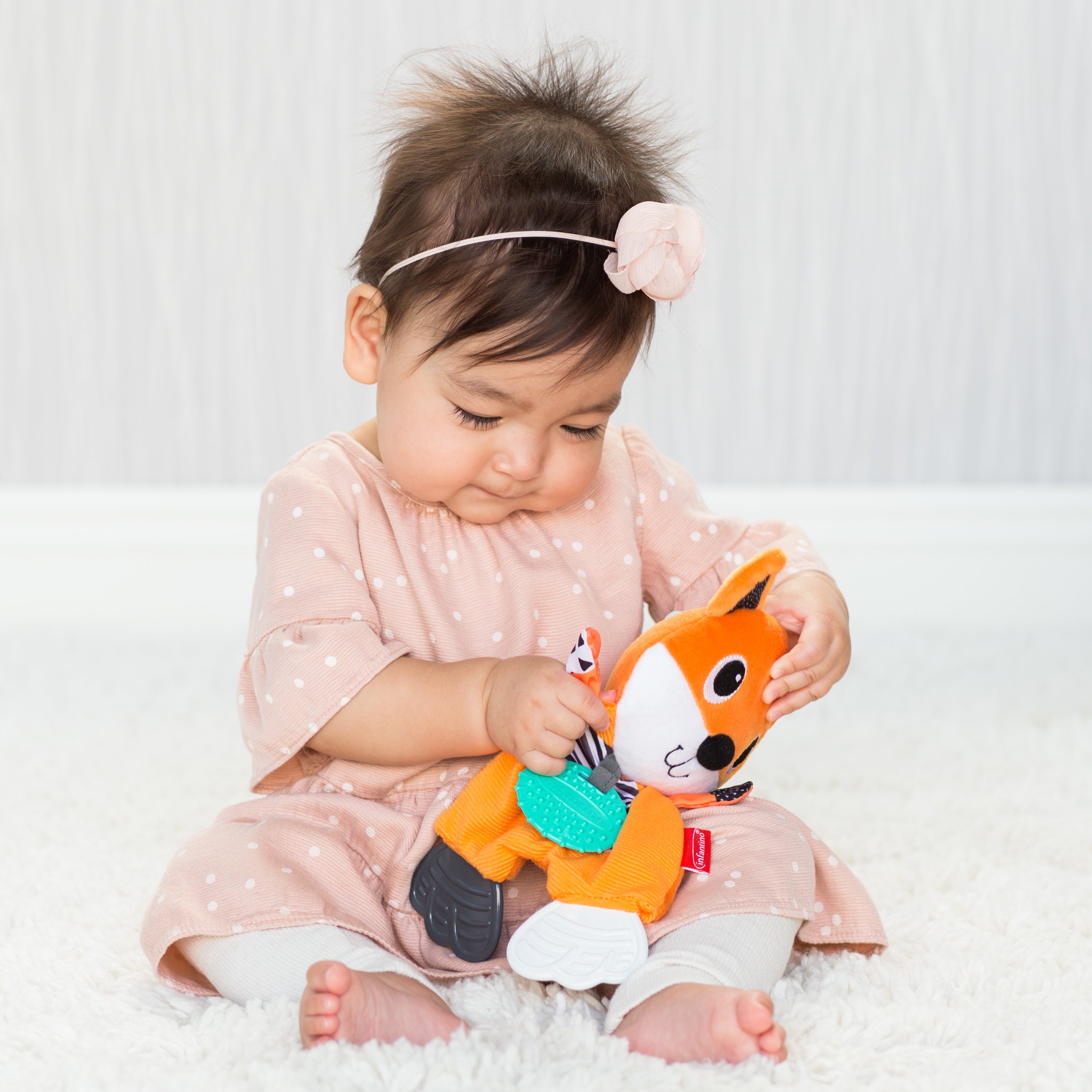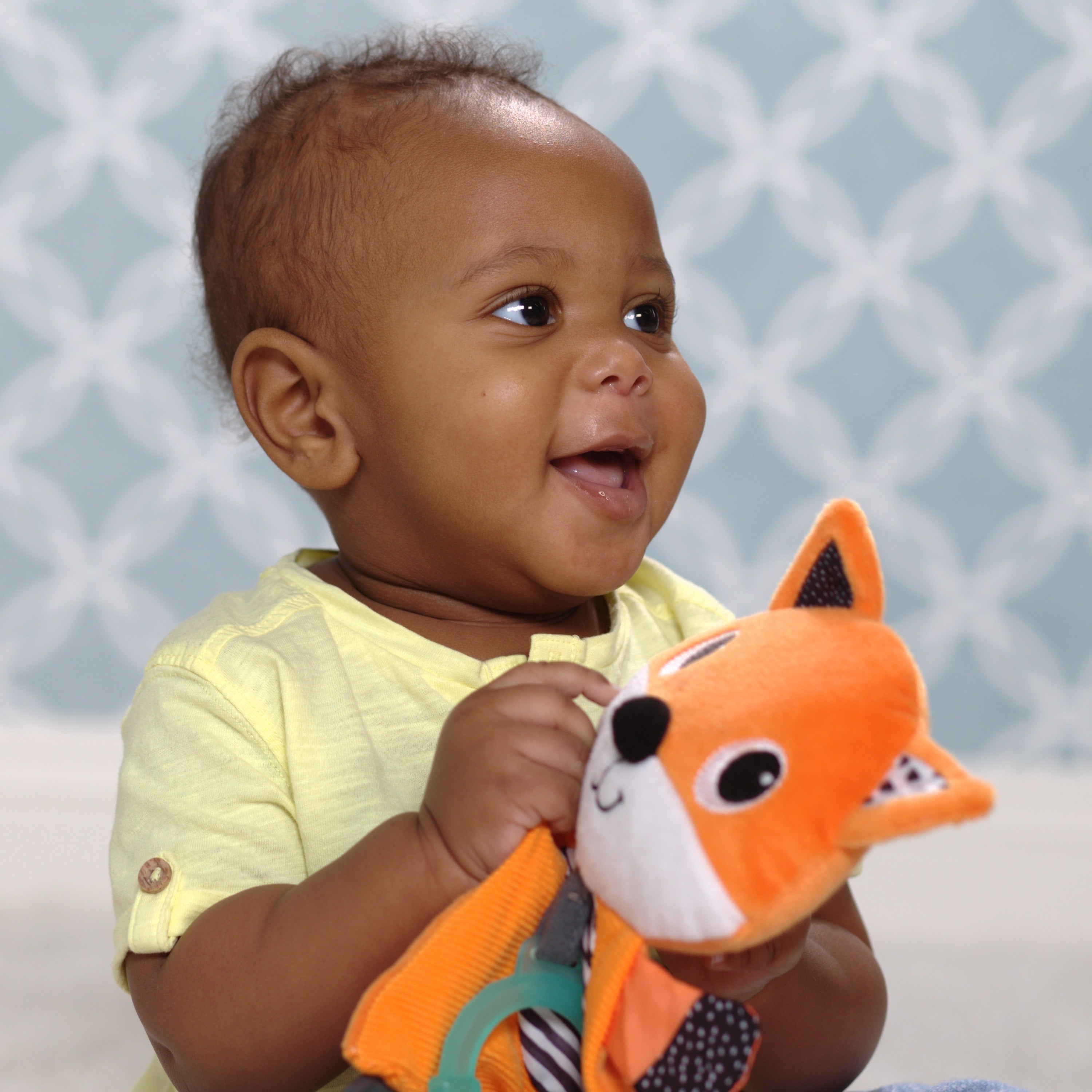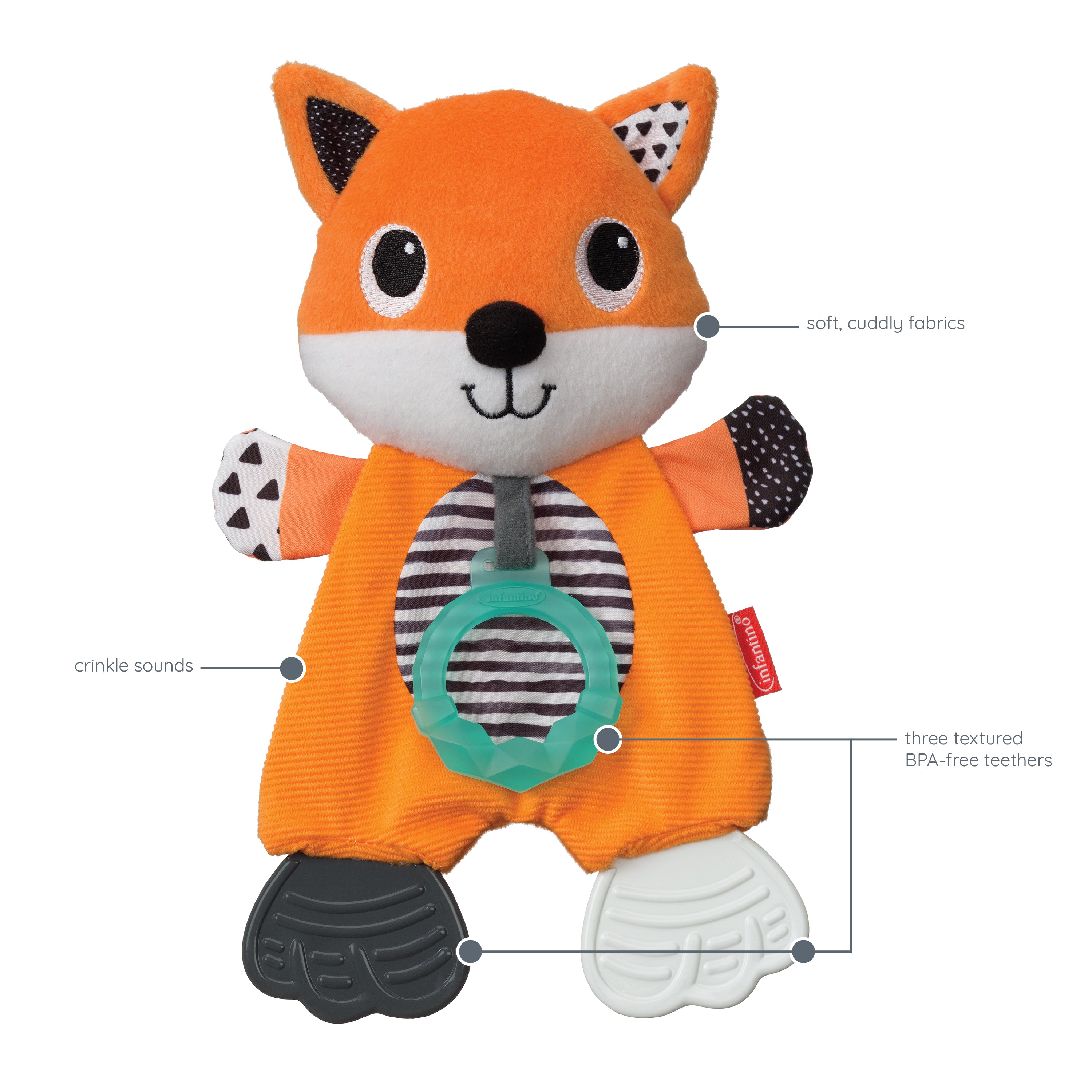 This snuggly teether toy features unique textures and crinkle sounds baby will love exploring. Babies are drawn to the bold colors, playful prints and soft fabrics. Features three BPA-teethers textured teethers for nibbling.